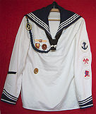 Kieler Hemd eines Maaten (auf Zeit) der seemännischen Ausbildung mit Sonderausbildung zum Signaler, der zusätzlich als Taucher ausgebildet wurde. Er trägt die 4 Soldatenauszeichnungen Schützenschnur, Klassifizierungs-abzeichen, Bestenabzeichen, Militär-Sportabzeichen sowie das Leistungsabzeichen der NVA. |