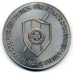 Typische Medaille, wie sie zur Entlassung als Erinnerungsplakette überreicht wurde. Hier für Genossen der Wacheinheit "Fritz Schmenkel" der Bezirksverwaltung für Staatssicherheit Karl-Marx-Stadt. |