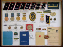 Schaukasten, in dessen oberen Teil Effekten und Medaillen der Deutschen Post ausgestellt sind (durch Anklicken vergrößern) |
