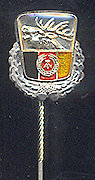 Das Jagdwesen in der DDR war noch in den 1950er Jahren als sogenannte "Sektion Jagdwesen" in die Gesellschaft für Sport und Technik -GST- integriert. Ab 1961 wurde dann die Jagd staatlichen Organen unterstellt. Es gab in diesem Spezialgebiet Ärmelabzeichen sowohl für Jagdleiter als auch für Leiter und Mitarbeiter in Staatsjagdgebieten. Diese runden Effekten wurden auf dem linken Unterärmel von Waldrock oder Waldbluse getragen. Beide Abzeichen sind auf der unten abgebildeten Schautafel in der Mitte des unteren Bereichs zu sehen. |