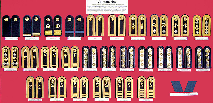 | Am Beispiel der Fähnriche sind in der mittleren Reihe die verschiedenen Möglichkeiten dargestellt, wie die Dienstlaufbahn mittels Metallauflage kenntlich gemacht wurde. Verwendet wurde diese Auflagen von den Meister- und Fähnrichdienstgraden, sowie ab 1983 auch von den Maatenschülern und Maaten/Obermaaten im Dienstverhältnis Berufssoldat. Zusätzlich wurde das Tragen dieser Symbole ab 1986 auch für die weiblichen Angehörigen der VM im Dienstverhältnis "Soldat auf Zeit" festgelegt. | ||