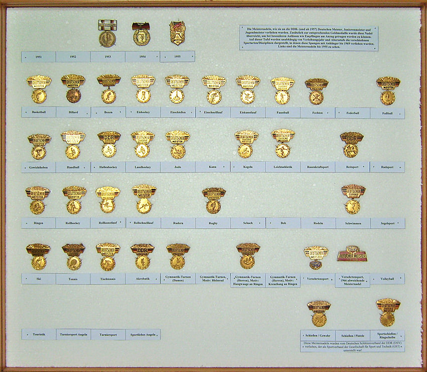 | In den Jahren 1951 bis 1969 wurden zusätzlich zu den Siegerplaketten bzw. Goldmedaillen die im Schaukasten ausgestellten Meisternadeln verliehen. Ab 1956 ähnelten sich dann die Spangen, indem jeweils ein Medaillon mit der entsprechenden Sportart angehängt wurde. Die Sieger führten bis 1957 den Titel DDR-Meister, ab 1957 bis 1969 dann Deutscher Meister. In einigen Sportarten wurden ebenfalls die Titel DDR-Junioren-Meister / Deutscher Junioren-Meister und DDR-Jugend-Meister / Deutscher Jugend-Meister ausgespielt und verliehen. Unabhängig von diesen Titeln und Jahreszahlen wird hier ein Medaillon je Sportart dargestellt. Ganz unten rechts sind Meisternadeln des Deutschen Schützenverbandes der DDR zu sehen, welcher als Sportverband der Gesellschaft für Sport und Technik (GST) unterstellt war. Alle anderen Sportverbände waren unter dem Dach des DTSB angesiedelt. | ||