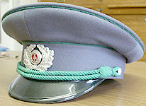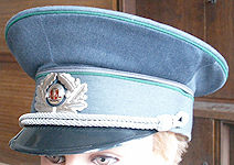 Schirmmütze der Dienstuniform der Kommissare, durch die silberne Kordel mit aus Blech gestanzter Kokarde zu erkennen. |
