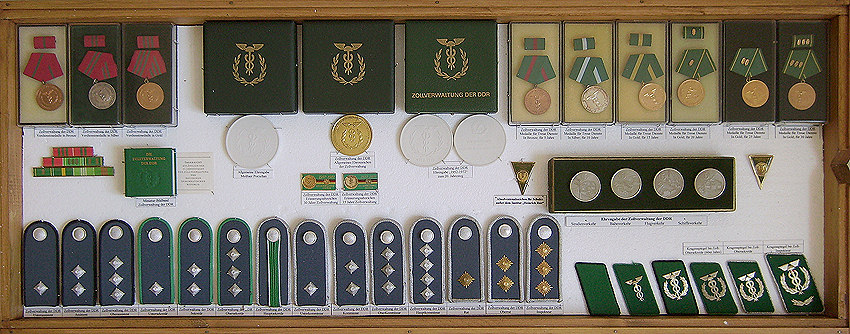 Im Schaukasten zur Zollverwaltung der DDR fehlt die Interimsspange zur Medaille "25 Jahre treue Dienste" und der 1972 gestiftete staatliche Ehrentitel "Verdienter Mitarbeiter der Zollverwaltung der DDR". Bei den Uniformen würde ich noch gern die Schirmmütze eines Zollrates oder Inspekteurs ausstellen. Kann da noch jemand eine beisteuern? Von den alten Schulterstücken des AZKW (die Zoll-Wachtmeister waren noch durch eine unterschiedliche Anzahl Quertressen auf den Dienstgradabzeichen gekennzeichnet), habe ich bisher leider kein Einziges mehr finden können. |