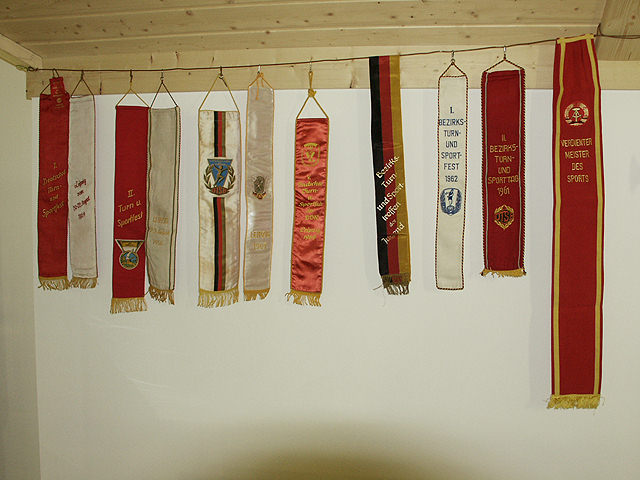 Sehr schön erhaltene Fahnenbänder und Schleifen, unter Anderen die der Deutschen Turn- und Sportfeste in Leipzig, hängen über der Sportecke.