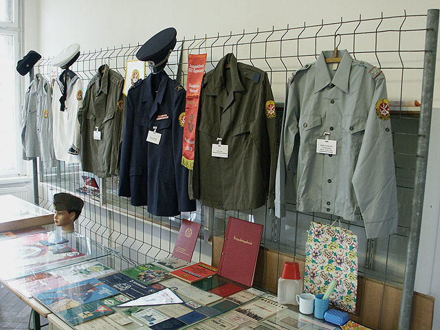 Selbst Bauzäune eignen sich hervorragend als Raumteiler oder Kleiderständer - hier mit GST-Uniformen.