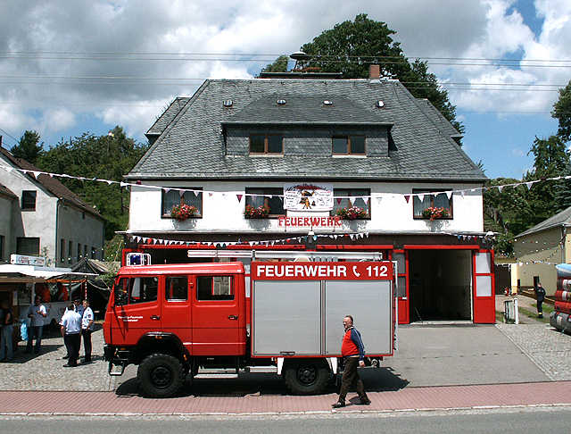 Im schönsten Sonnenschein präsentierte sich das geschmückte Feuerwehr-Gerätehaus, in dessen 2. Obergeschoss ich meine Ausstellung aufgebaut hatte. Im Vordergrund der Stolz der Markersdorfer Wehr, das eigene Löschfahrzeug Mercedes LF 8/6.