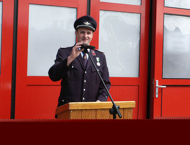 | Der Wehrleiter, Kam. Kai Ludwig, bei seiner Eröffnungsansprache. Ihm und der Mithilfe seiner Kameraden ist zu verdanken, das Markersdorf ein herrliches Programm mit Feuerwehrrundfahrten, Kinderfest und Tanz am Gerätehaus erleben konnte. Dafür nochmals herzlichsten Dank! | ||