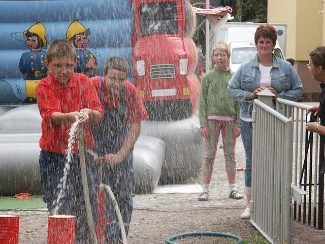 | Gleich zu Beginn des Kinderfestes übten schon mal die kleinen Gäste, mit dem Strahl der Kübelspritze Blechdosen zu treffen. Vielleicht sind es in ein paar Jahren junge Feuerwehrmänner? Die im Hintergrund aufgebaute Hüpfburg war später vor lauter Kindern kaum noch zu sehen. | ||