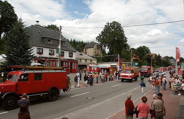 Reichlich Zuschauer säumten die Straßen, als mit Blaulicht und Sirenengeheul am Samstag Nachmittag ein Korso historischer und moderner Feuerlöschfahrzeuge durch Markersdorf fuhr.