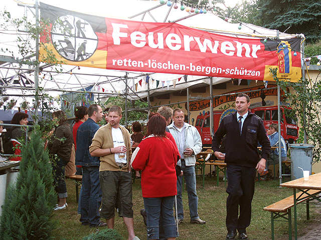 | Im Improvisieren schon immer Meister, überdachten die Kameraden mit einigen Helfern die Freifläche hinter dem Gerätehaus und ließen so ein großes Festzelt entstehen. Das abendliche Tanzvergnügen wurde dann auch so gut angenommen, dass nach 4:00 in der Frühe immer noch Gäste angetroffen wurden, die Tanzfläche war Dank der gelungenen Musikauswahl zu keiner Zeit leer! | ||
