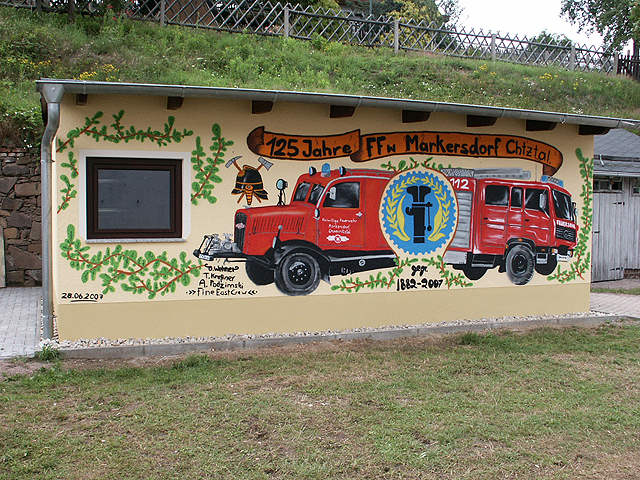 | Als wahre "Helden mit der Spraydose" erwiesen sich die Jungs der "Fine East Crew", wie sie sich selbst bezeichnen. Auf Einladung der FFW gestalteten sie im Vorfeld der Veranstaltung diese Garagenwand. Für diese gelungene künstlerische Leistung bekamen Alexander Podzimski, Oliver Wehner und Thomas Kressner reichlich Beifall (und so manches kühle Bierchen). | ||