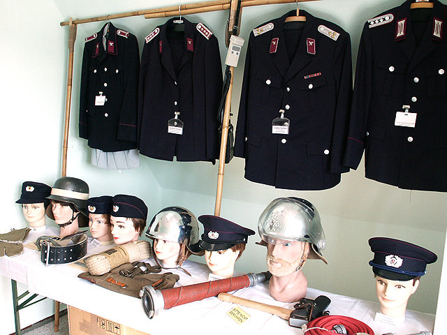 Der erste Raum, den ich ausgestattet hatte, war der Feuerwehrgeschichte gewidmet. An dieser Wand waren Utensilien, Kopfbedeckungen und Uniformen sowohl der FFW wie auch der Berufsfeuerwehr (ganz rechts) zu sehen.