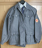 Dienstuniform eines hauptamtlichen DRK-Mitarbeiters. Seine Kragenspiegel weisen ihn als Vorsitzender eines Kreiskomitees aus. |