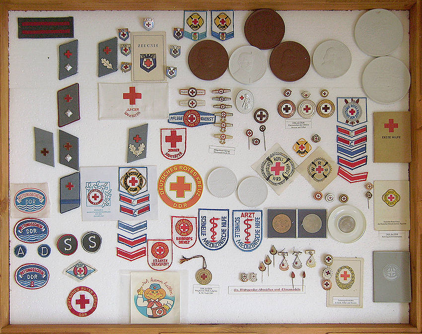 Der DRK-Schaukasten ist zur Zeit in Überarbeitung, deshalb sind hier noch viele Exponate unbeschriftet und lose eingelegt. Ich werde 2 Kästen entstehen lassen müssen, da ich in letzter Zeit noch gute Zuarbeit vom Wasserrettungsdienst der DDR bekam und auch noch vom Bergrettungswesen einige Stücke erhoffe. Leider fehlen noch eine ganze Anzahl der verschiedenen Kragenspiegel und Dienststellungskennzeichen für die Blusen. |