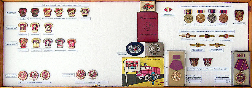 Die beiden Medaillen in den Verleihungsetuis sind die Staatlichen Auszeichnungen "Medaille für Verdienste im Brandschutz"(links) und das "Ehrenzeichen für hervorragende Leistungen im Brandschutz", das 1983 gestiftete wurde. Ich suche auch noch einige der auf der linken Seite abgebildeten Siegeranstecknadeln der Kreis-, Bezirks- und DDR-Ausscheide, von denen es eine enorme Vielfalt gab. |