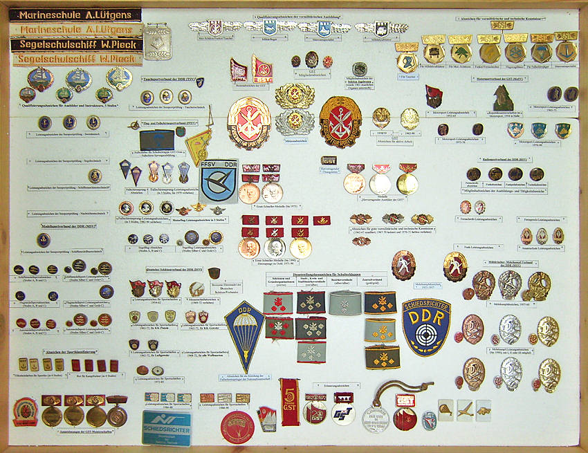 Von Veranstaltungsabzeichen einfachster Art bis hin zu Medaillen eines Deutschen Meister im Seesport der 1960er Jahre ist schon allerhand vorhanden. Die auf der Tafel noch zu sehenden Lücken bemühe ich mich natürlich zu schließen, so gut mir das gelingt! |