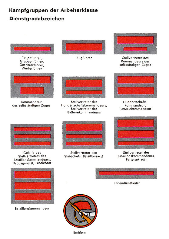 Die Dienstgradabzeichen der Kampfgruppen der Arbeiterklasse haben sich seit deren Einführung 1958 in der Bedeutung etwas verändert. Einige Abzeichen, zum Beispiel das des Gruppenführers, des Zugführes oder des Hundertschaftskommandeurs blieben unverändert. Die hier Abgebildeten waren so von 1971 bis 1990 gültig. Sie bestanden aus roten Tressen, die auf graue Tuchunterlage aufgenäht waren. Die Tressen waren 10 und 20mm breit sowie 70 und 100mm lang. Ausnahme Innendienstleiter: 10mm breite Tresse, 150mm lang. Die Dienststellungsabzeichen wurden auf dem rechten Oberärmel des Kampfanzuges getragen. |